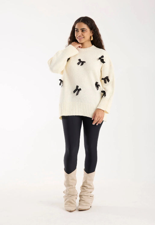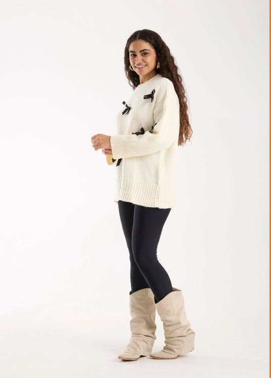 Pull blanc cassé avec Nœuds Satinés Noirs